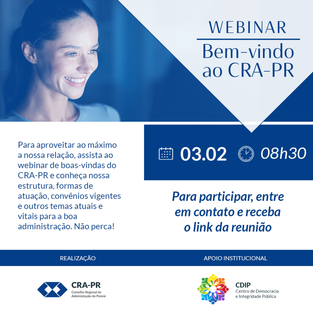 Legenda: Sejam bem-vindos, novos registrados. Para aproveitar ao máximo a nossa relação, assista ao webinar de boas-vindas do CRA-PR e conheça nossa estrutura, formas de atuação, convênios vigentes e outros temas atuais e vitais para a boa administração. Não perca! Nosso encontro virtual acontece nesta quarta-feira (03/02), às 8h30. Para participar, entre em contato com a gente!