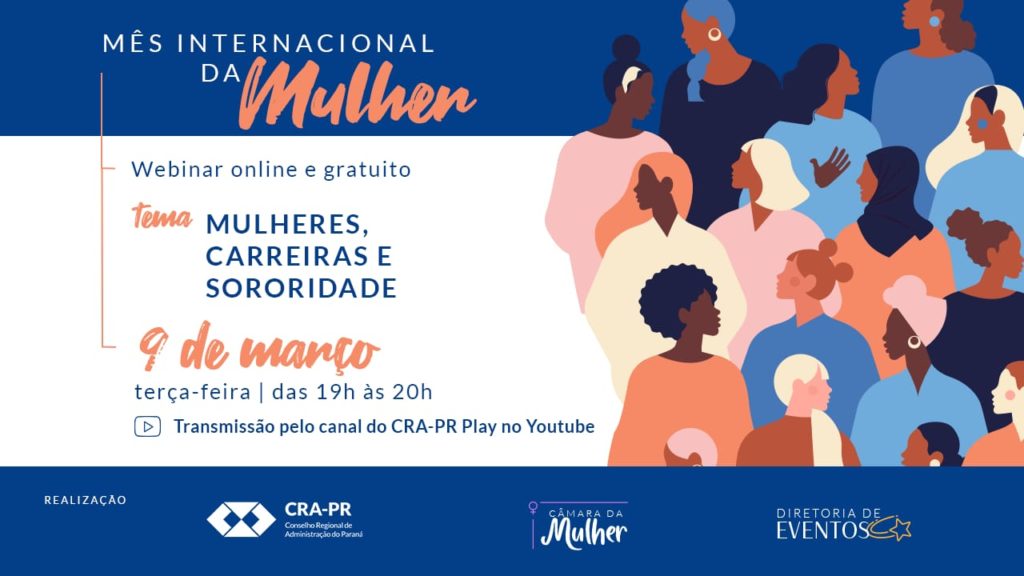 O CRA-PR preparou um evento especial para comemorar o Mês Internacional da Mulher. Dia 9 de março, das 19h às 20h, a Câmara da Mulher Administradora e a Diretoria de Eventos do CRA-PR convidam mulheres, administradoras registradas e demais interessadas, para o webinar Mulheres, carreiras e sororidade, com a participação das convidadas Adm. Adriana Martello Valero, administradora, especialista em Gestão de Pessoas e mestre em Economia, professora titular da PUCPR Campus Londrina e consultora em Liderança, e de Zeni Oliveira, analista comportamental (DISC), facilitadora de treinamentos e condução de assessment de executivos, coordenadora de Atração, Recrutamento, Seleção e Inclusão. O Adm. Sergio Pereira Lobo, Presidente do CRA-PR, será responsável pela abertura do evento, que vai ser mediado pela Adm. Joice Fabrício, Coordenadora da Câmara da Mulher Administradora do CRA-PR. Para atender determinação do Governo do Estado do Paraná, o webinar vai substituir o coffee break presencial anunciado anteriormente, com a mesma qualidade e também gratuito. Participe da nossa conversa sobre empreendedorismo feminino, importância do apoio entre mulheres e diversos outros assuntos essenciais para a mulher administradora. A transmissão será feita pelo canal CRA-PR Play, no YouTube.