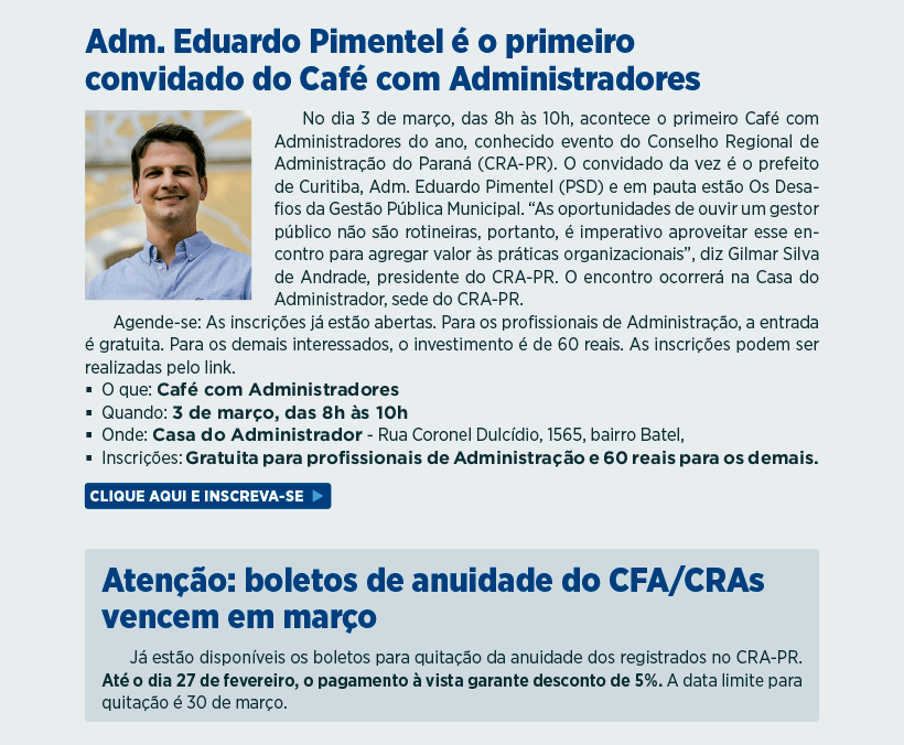 Primeiro Café com Administradores de 2026 do CRA-PR será com o prefeito de Curitiba